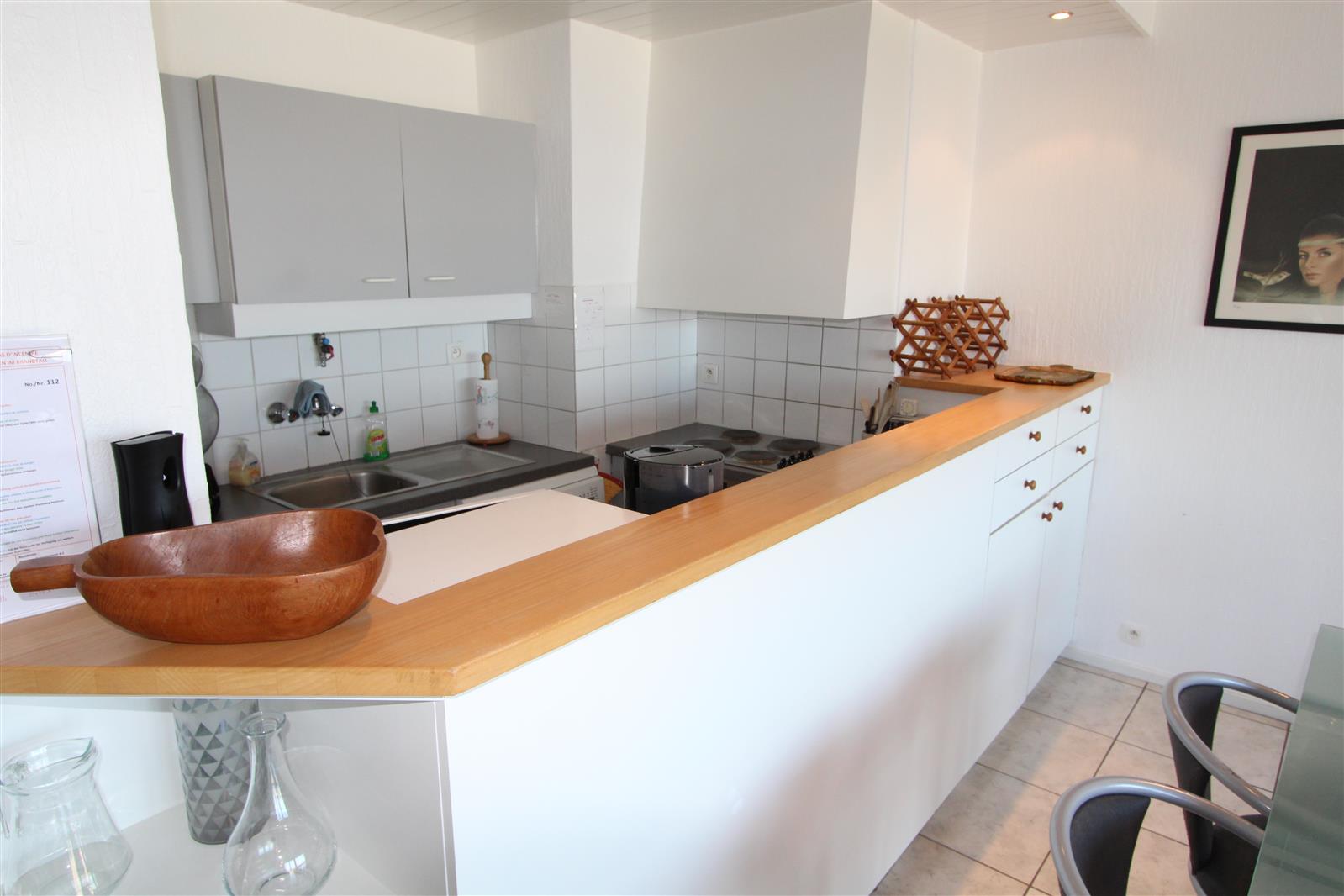Appartement situé au centre du Zoute avec cuisine ouverte et vue mer frontale. 2 chambres à coucher, une salle de bain, emplacement inclus.