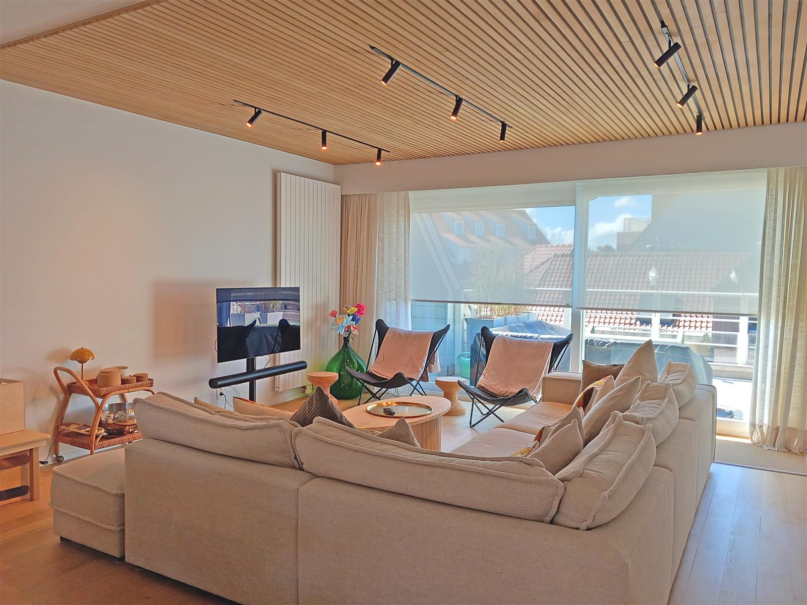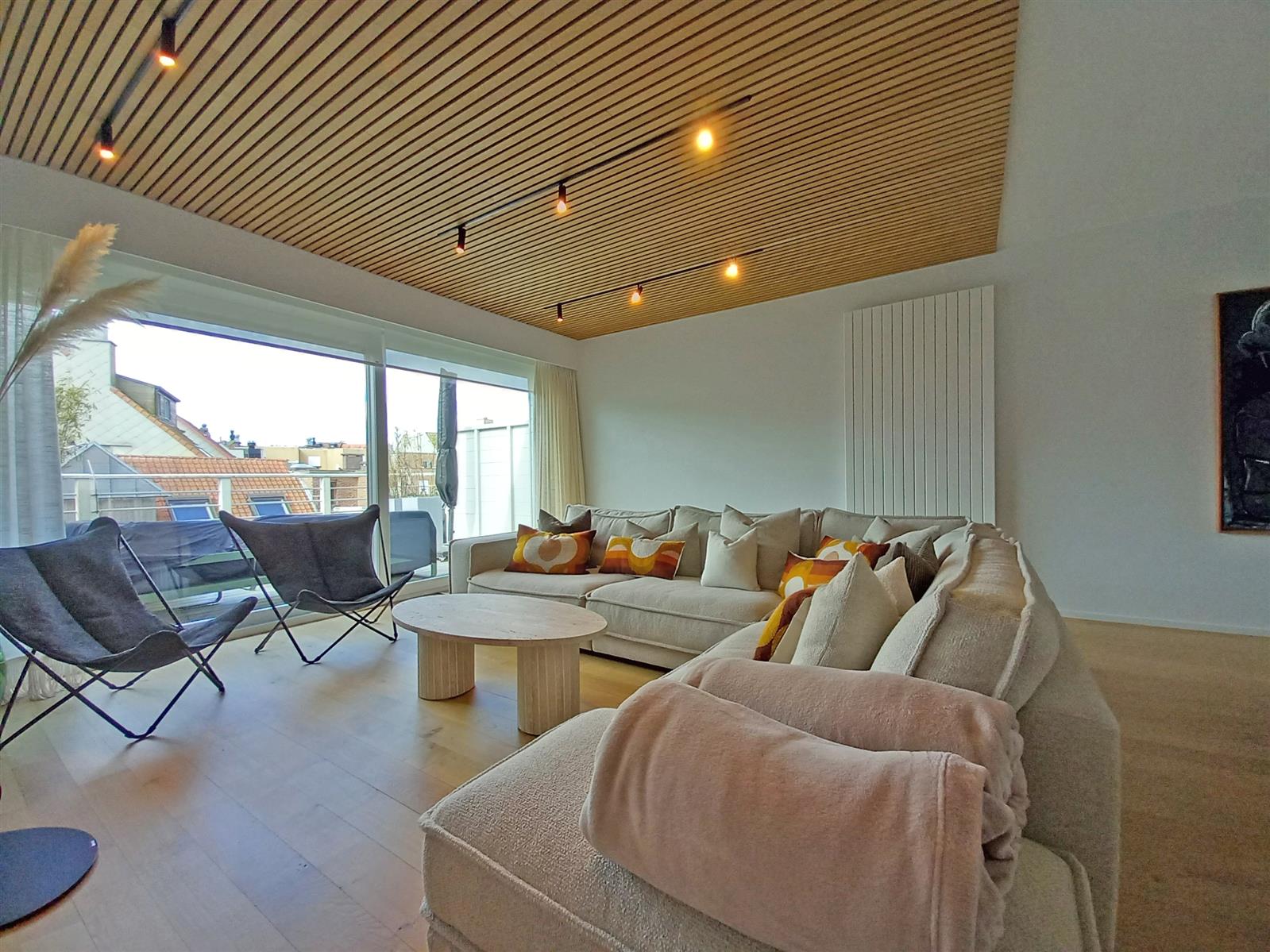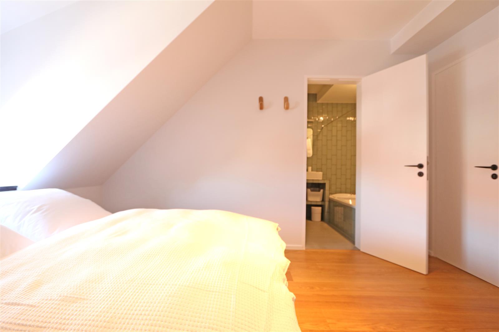 Charmante duplexpenthouse, smaakvol ingericht en voorzien van een open keuken. De woning beschikt over royale zonneterrassen aan zowel de voor- als achterzijde. Op de benedenverdieping bevindt zich een eerste dubbele slaapkamer met en-suite badkamer. De bovenverdieping omvat twee extra kamers: een ruime dubbele slaapkamer met complete badkamer en een kinderkamer met aangrenzende douchekamer. Een garagebox in de residentie is inbegrepen.