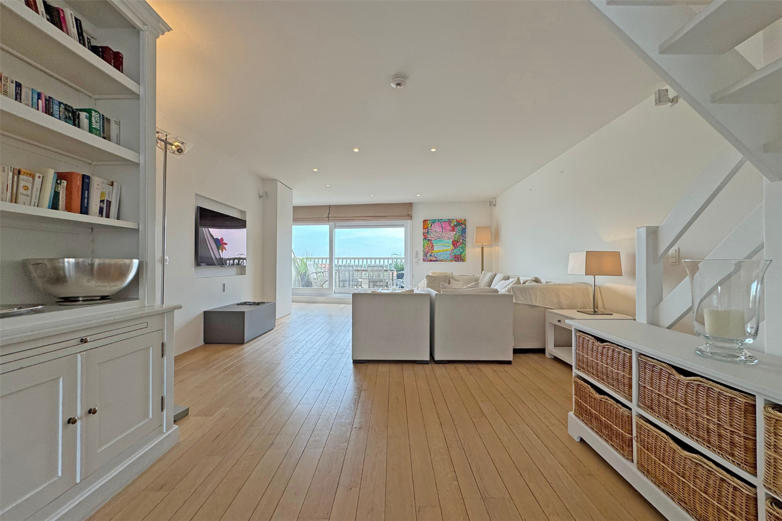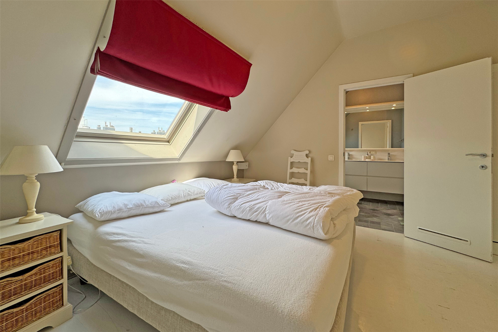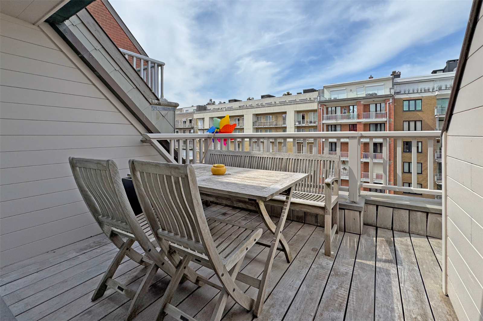 Lumineux duplex appartement met 2 zonnige terrassen aansluitend aan de leefruimte. U geniet een dubbele kamer met eigen badkamer, een 2de dubbele slaapkamer en een slaapkamer met stapelbed. Er is een extra badkamer met douche in de gang. Verder beschikt u over een garagebox in de buurt.