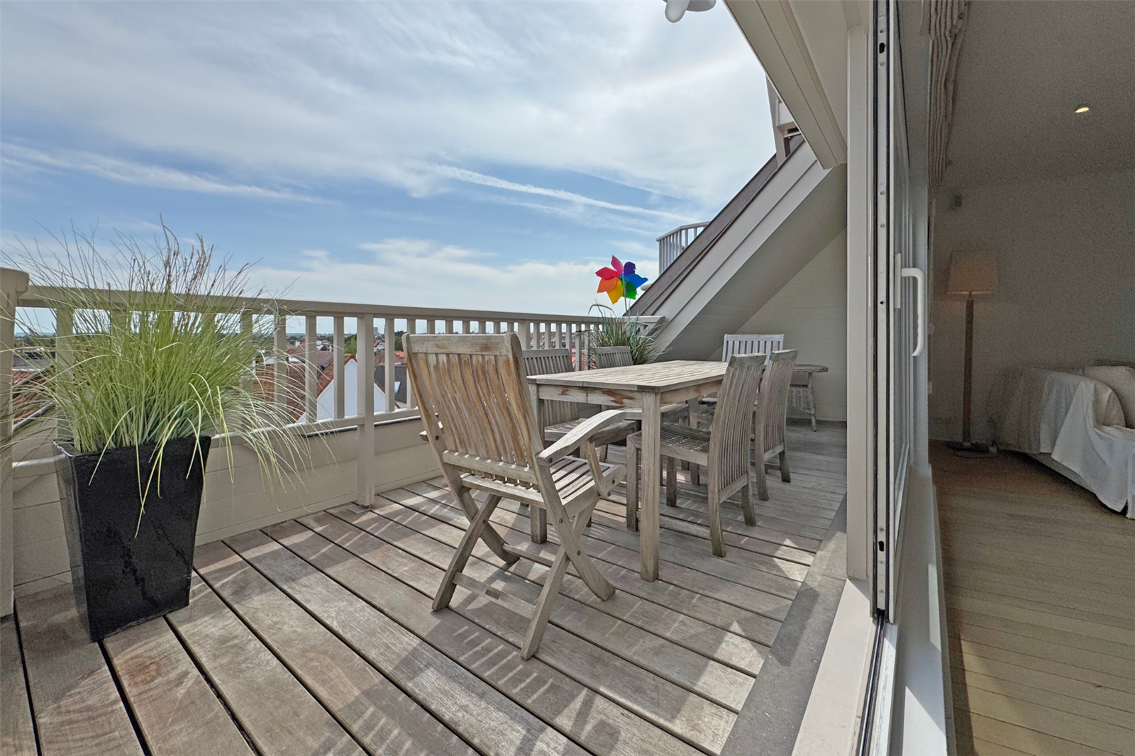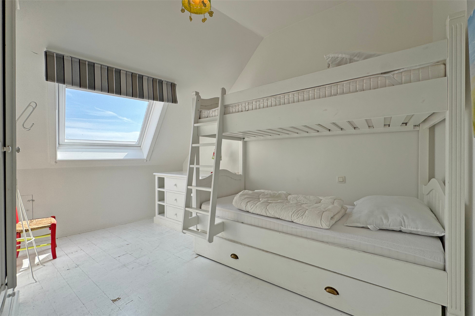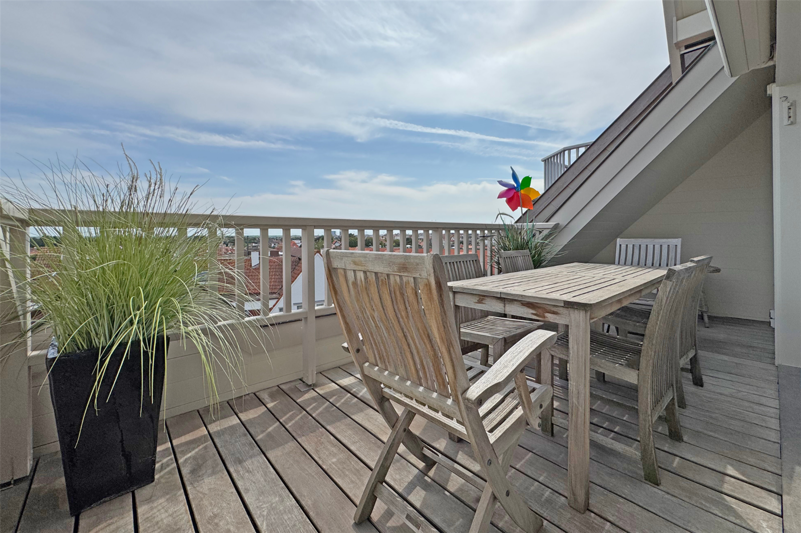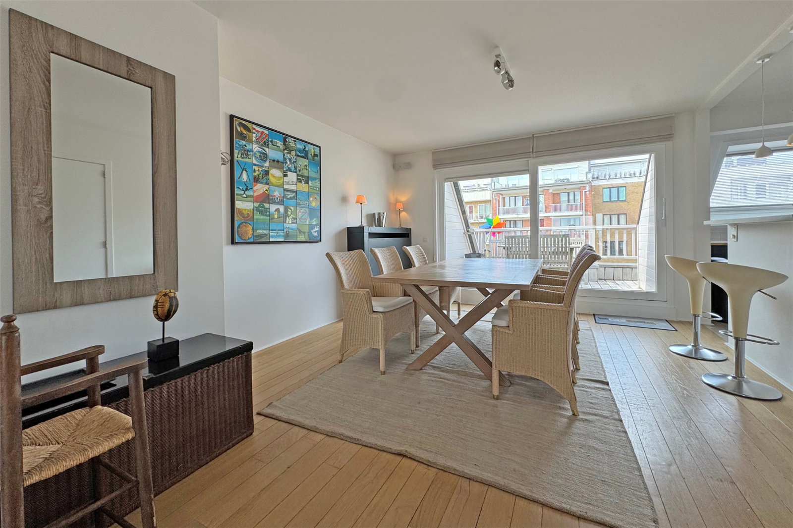Lumineux duplex appartement met 2 zonnige terrassen aansluitend aan de leefruimte. U geniet een dubbele kamer met eigen badkamer, een 2de dubbele slaapkamer en een slaapkamer met stapelbed. Er is een extra badkamer met douche in de gang. Verder beschikt u over een garagebox in de buurt.