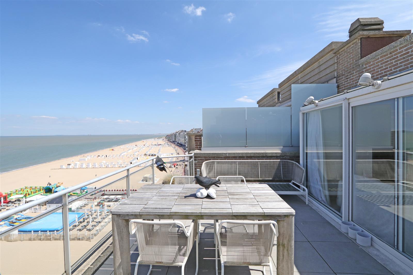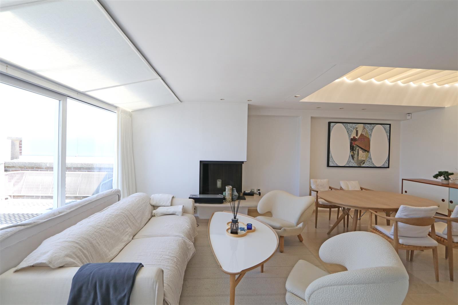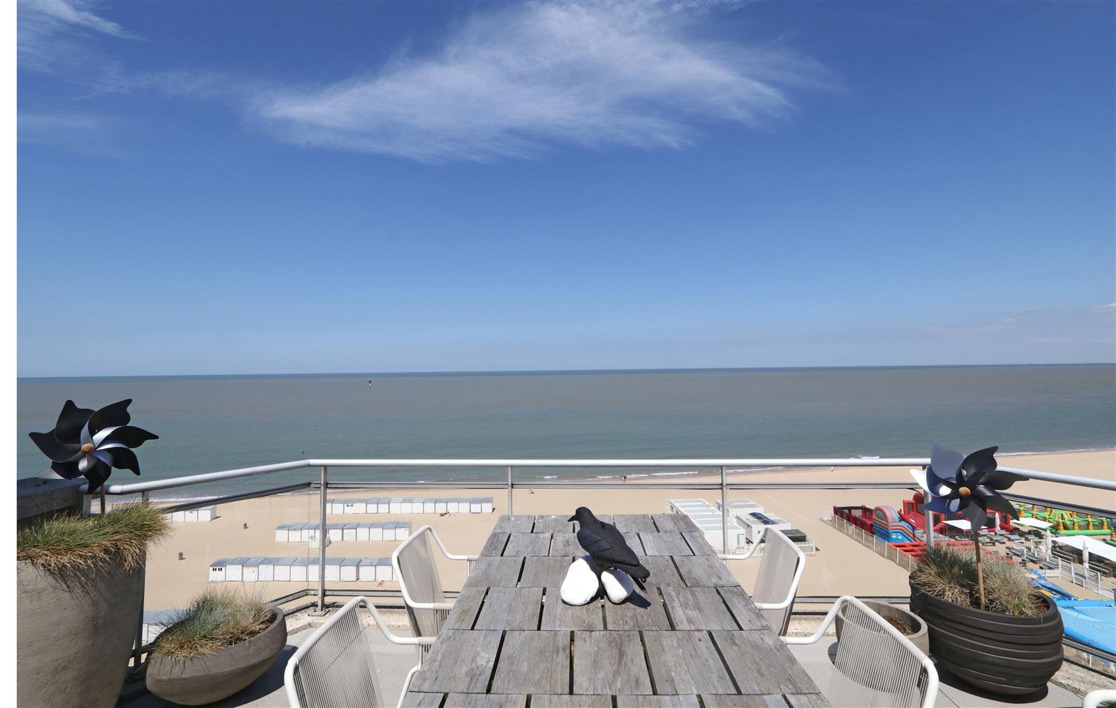 Trendy appartement met fenomenaal zeezicht. Smaakvol ingericht met design meubilair. Twee schitterende terrassen : vooraan met zeezicht - achteraan met volledige privacy. Mogelijkheid garage te huren in supplement.