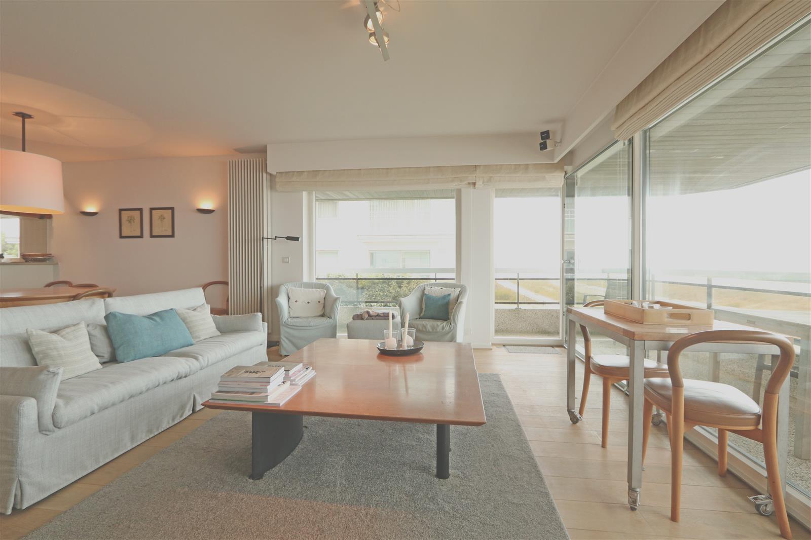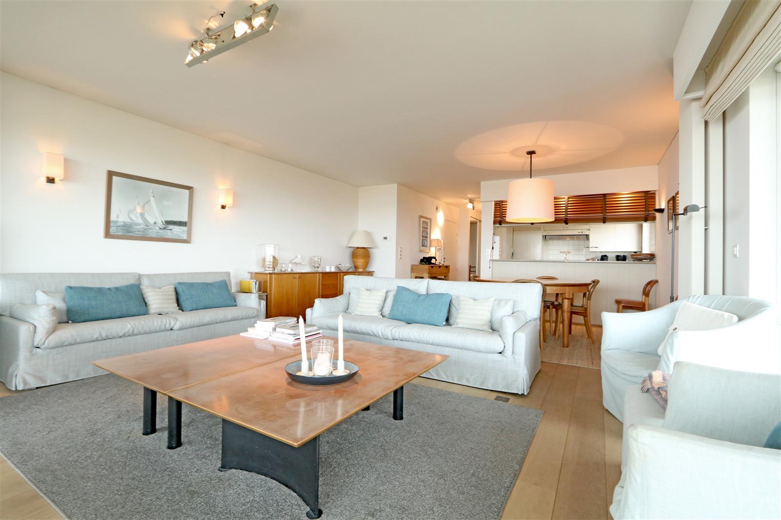Topligging op de wandeldijk : modern ingericht appartement met open keuken en frontaal zeezicht. Ruime terrassen voor- en achteraan, 3 slaapkamers elk met eigen badkamer, autostaanplaats in het gebouw.
