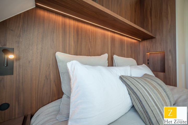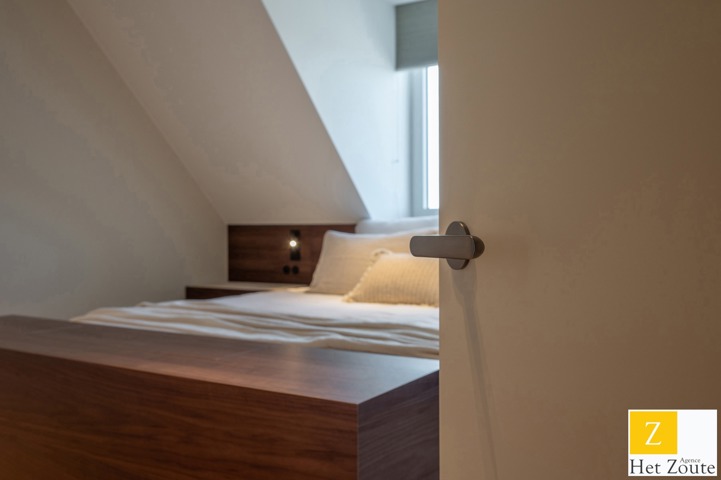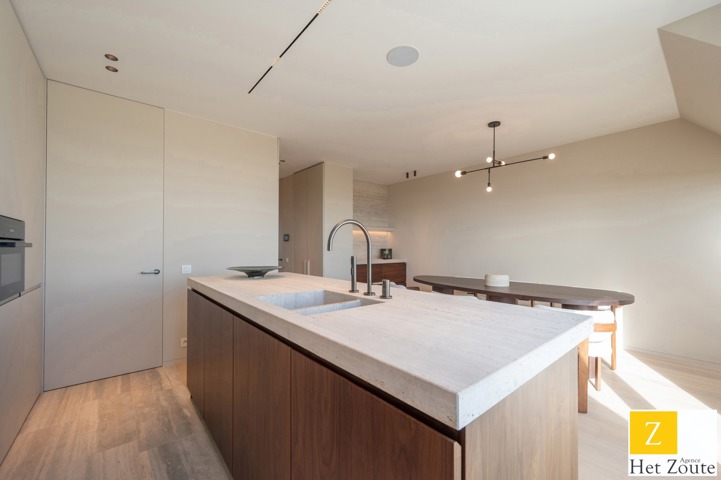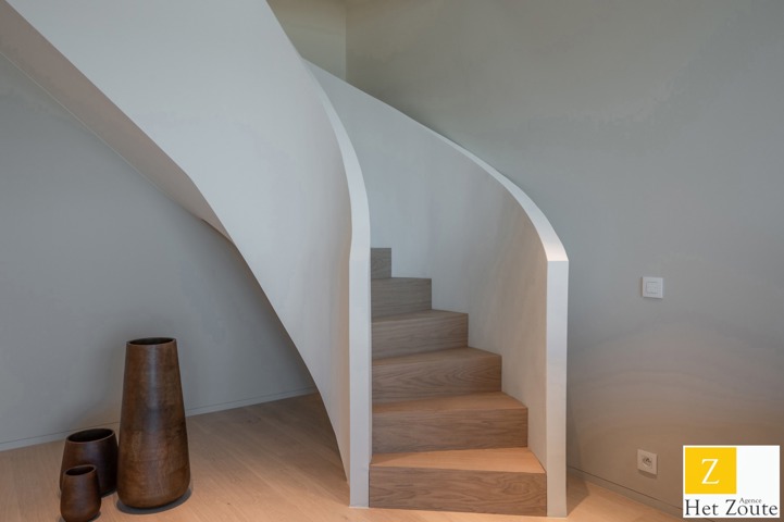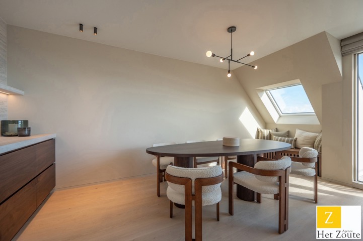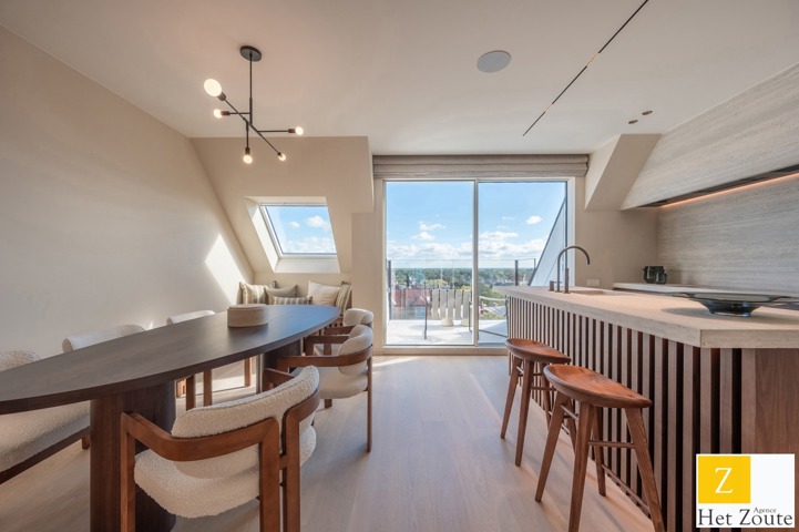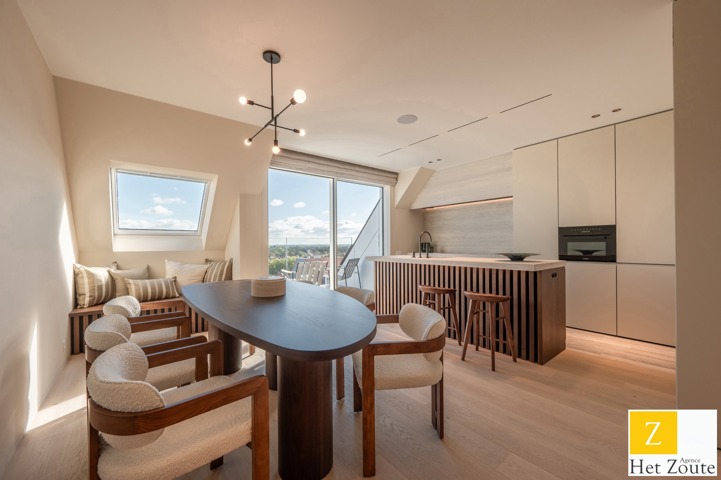 Op de 8e verdieping bevindt zich de open leefruimte, die naadloos overgaat in de designkeuken, uitgerust met Miele-toestellen. Verder zijn er een berging, een apart toilet en twee terrassen: één met een panoramisch uitzicht op de zee, de andere met uitzicht over de elegante villa’s van Het Zoute. De spiraalvormige trap, een kunstzinnige toevoeging aan de ruimte, leidt naar de 9e verdieping, waar drie slaapkamers zich bevinden.