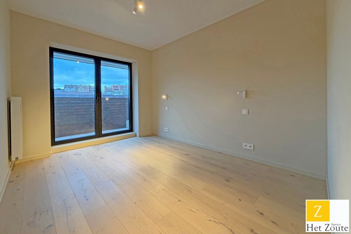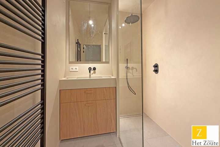 Het appartement werd volledig gestript en met oog voor detail vernieuwd volgens hedendaagse normen, wat resulteert in een stijlvolle en comfortabele woonst. U komt binnen via de inkomhal die uitgeeft op een volledig ingerichte open keuken, naadloos verbonden met de zeer ruime en lichtrijke woonkamer. Vanuit de leefruimte heeft u toegang tot het terras, waar u geniet van een rustgevend zicht op tuinen.