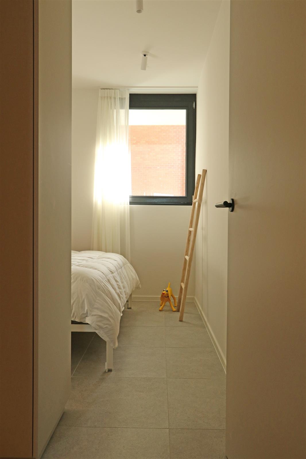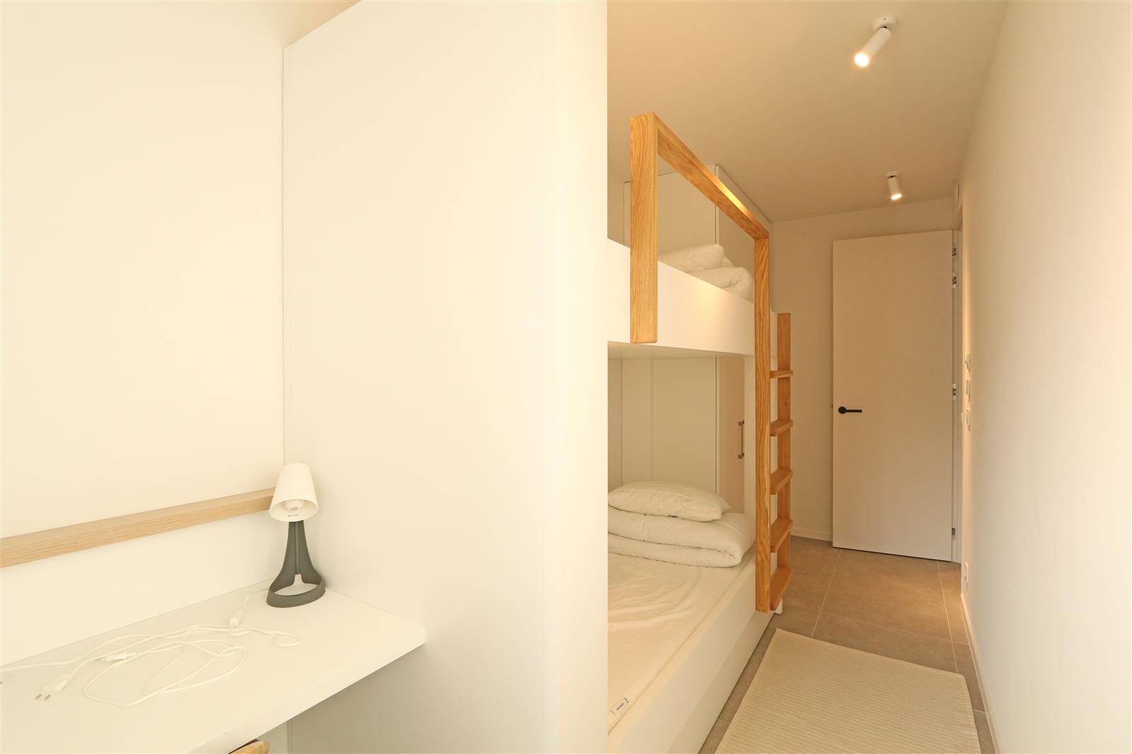 Modern nieuwbouwappartement met een dubbele kamer met ensuite badkamer met lavabo, inloopdouche en toilet. Er is een 2de kamer met stapelbed en bureau en een 2de douchekamer.