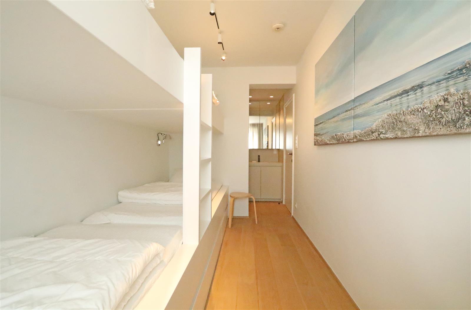 Luxueus afgewerkt appartement met open zicht op zee en een ruim terras aan de voorzijde. Het appartement beschikt een ruime leefruimte met open keuken en toegang tot het terras. Verder zijn er drie slaapkamer, elk met eigen badkamer : De indeling omvat een dubbele slaapkamer met en-suite badkamer voorzien van een ligbad met douchestang, een kinderkamer met twee stapelbedden en een douchekamer, en een derde slaapkamer met twijfelaar en eigen douchekamer. Een private staanplaats is inbegrepen.