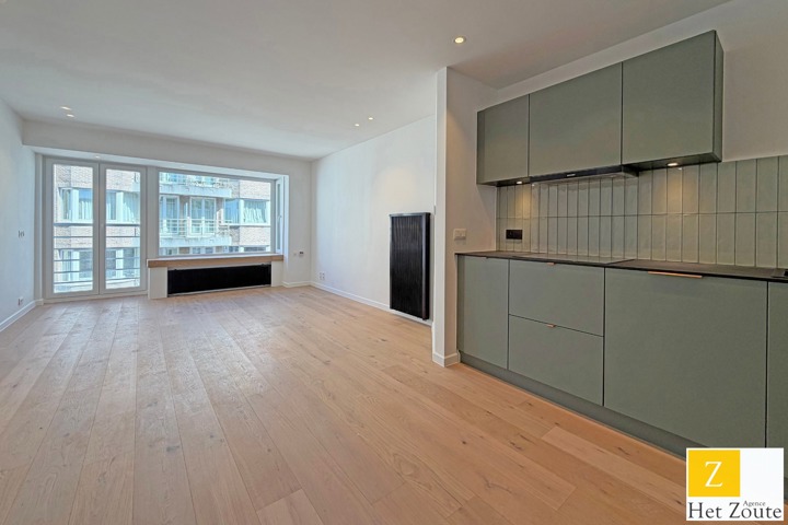 Het appartement werd recent volledig gerenoveerd met oog voor comfort en hedendaagse afwerking. Bij het binnenkomen betreedt u de lichtrijke woonkamer met een volledig uitgeruste open keuken, die naadloos aansluit op de leefruimte. De hal biedt toegang tot een apart toilet, een moderne douchekamer met lavabo en twee slaapkamers.