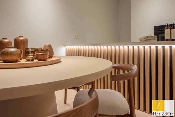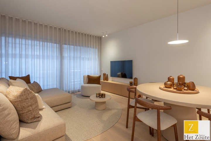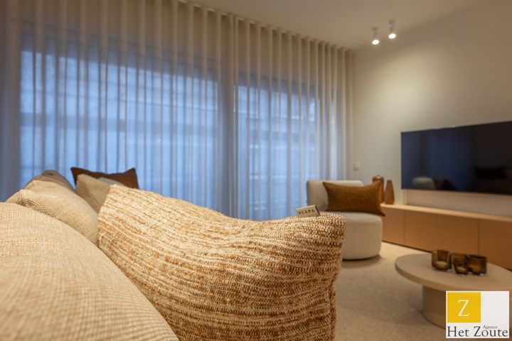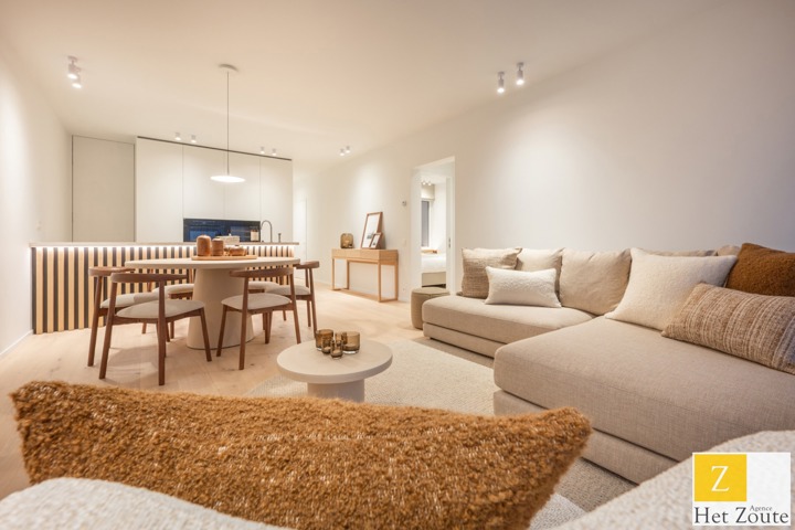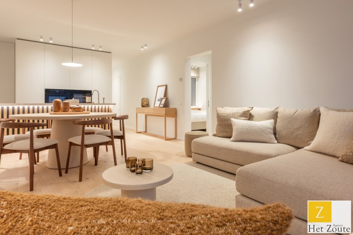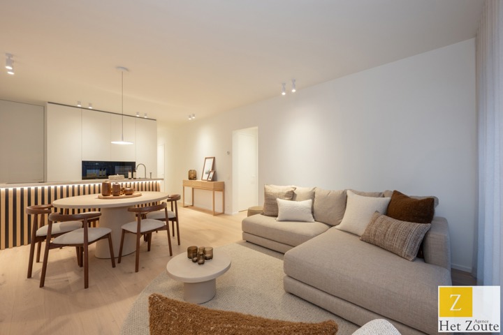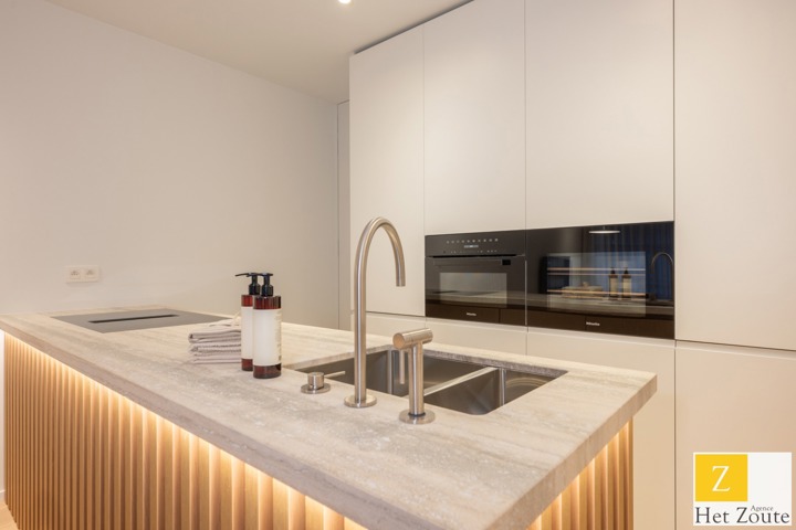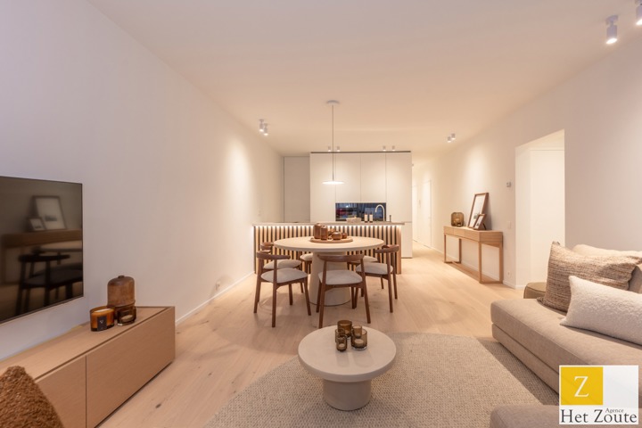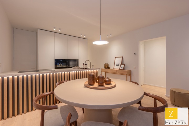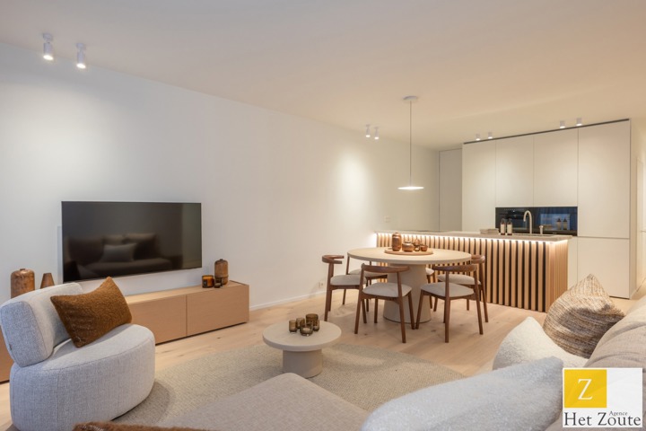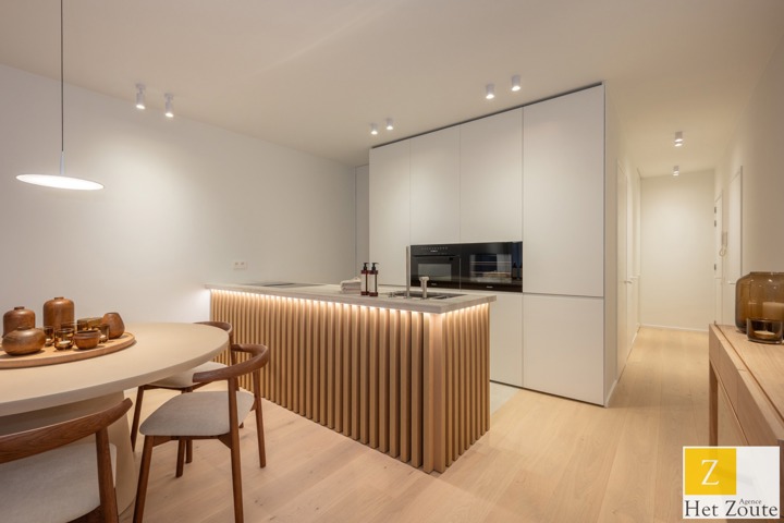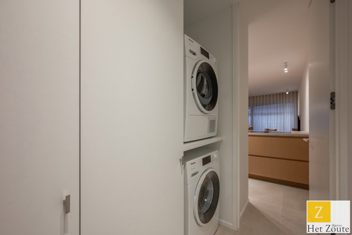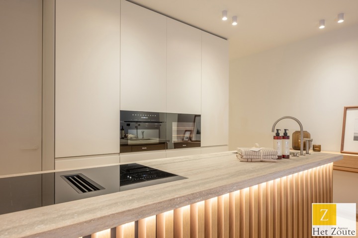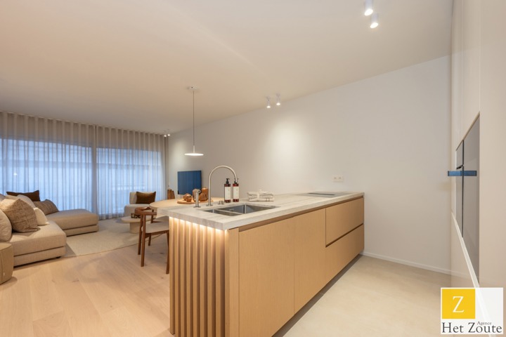 Via de inkomhal met vestiaire komt u in de aangename en lichtrijke leefruimte, die uitgeeft op het terras aan de voorzijde. Hier geniet u volop van de middagzon en een zijdelings zicht op zee. De open keuken sluit naadloos aan bij de leefruimte en beschikt over een praktische berging met aansluiting voor wasmachine en droogkast.